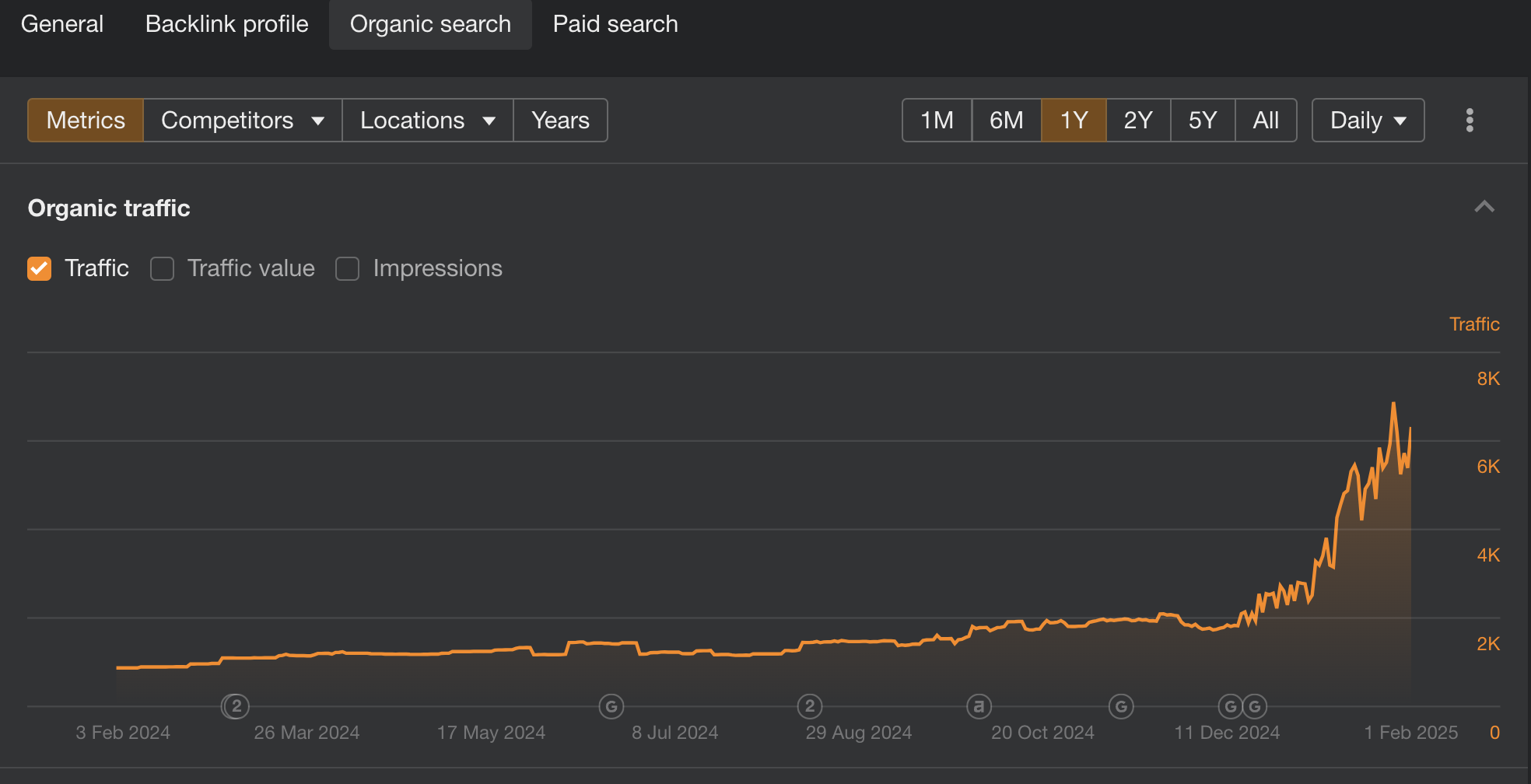 So if your realistic goal is to rank in position 3, take your search volume (8,000) and multiply it by 11%. That gives you roughly 880 visitors per month.