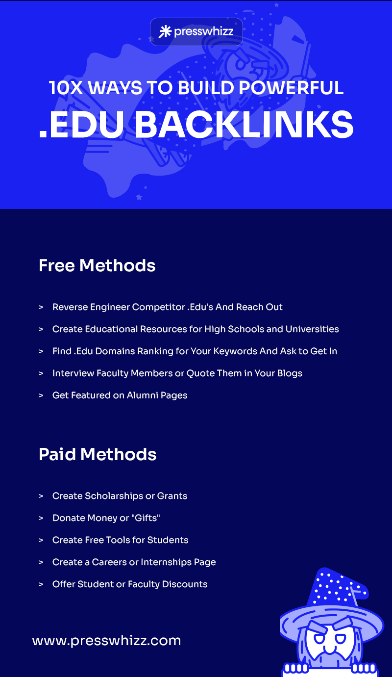 For free methods, I recommend building broken .edu backlinks, creating linkable assets and pitching them to unis, or getting featured on alumni association pages. If you’ve got the budget, I recommend sponsoring an event, donating, or creating a scholarship.