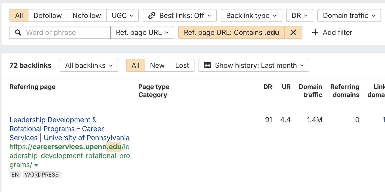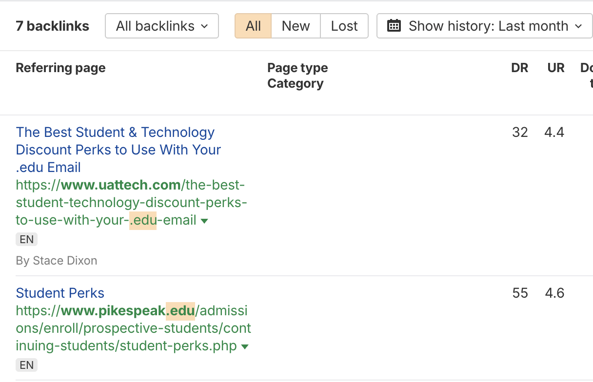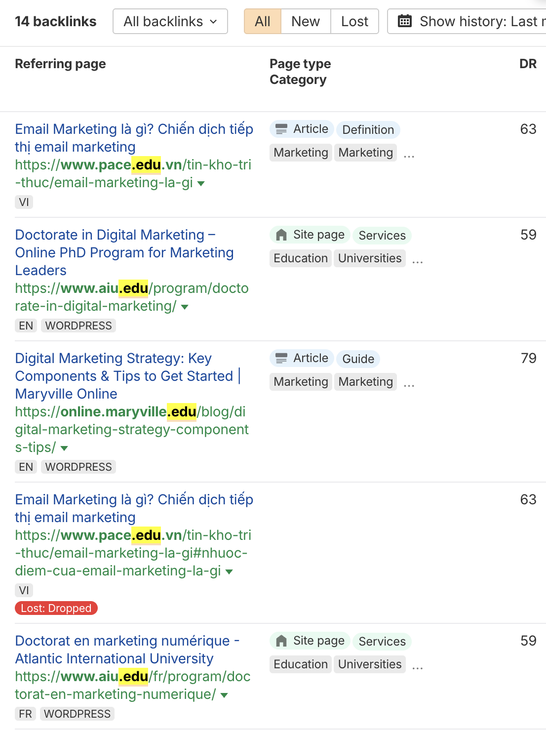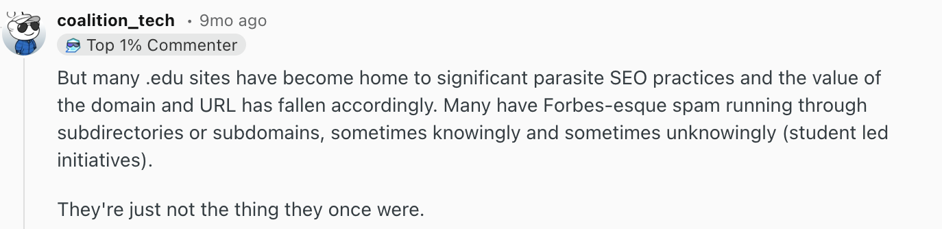 I’m not saying .edus aren’t valuable. They are extremely valuable. They’re often DR 70+ sites with high trust from Google and in-depth topical authority. And Google clearly gives some preference to the .edu/.gov TLD despite what they say publicly. I’m just saying that you should prioritize relevant, contextual links from your niche rather than fighting to the death over .edus simply because of the extension.