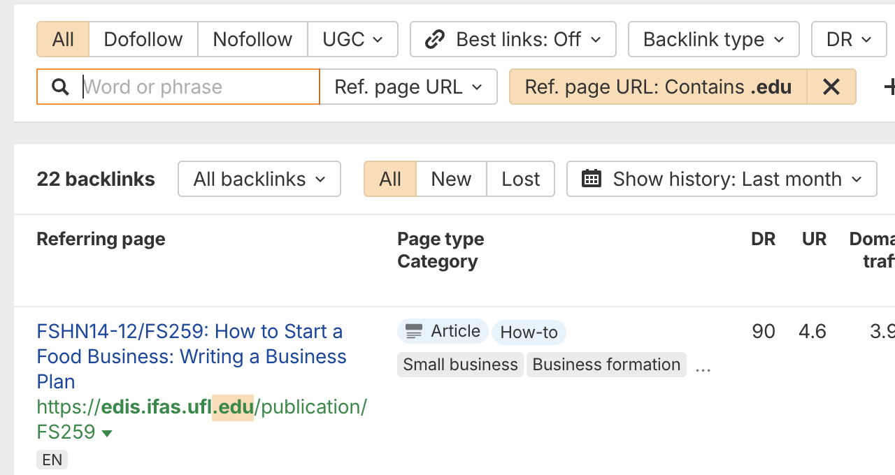 In my experience, .gov domains tend to skew higher in DR across the board. Government sites are heavily regulated and carry an enormous amount of trust. They are, after all, the official websites of the government. But DR alone isn’t as important as relevance.