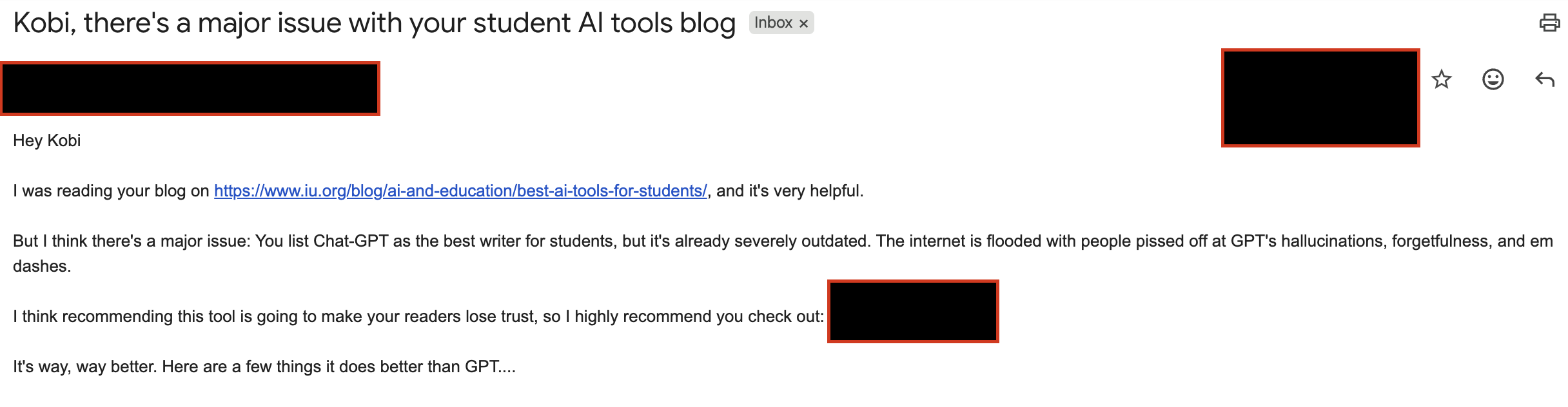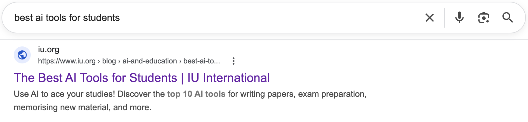 My #1 creative way to get .edu backlinks here is by trying to get into product roundups. This way, there’s no conflict of interest. You get a link, your name gets mentioned, and the school doesn’t help a competitor outrank them. Everyone goes home happy.Imagine you had an AI tool (like everyone else these days). You could look for universities ranking for that term and get your product on their listicle: