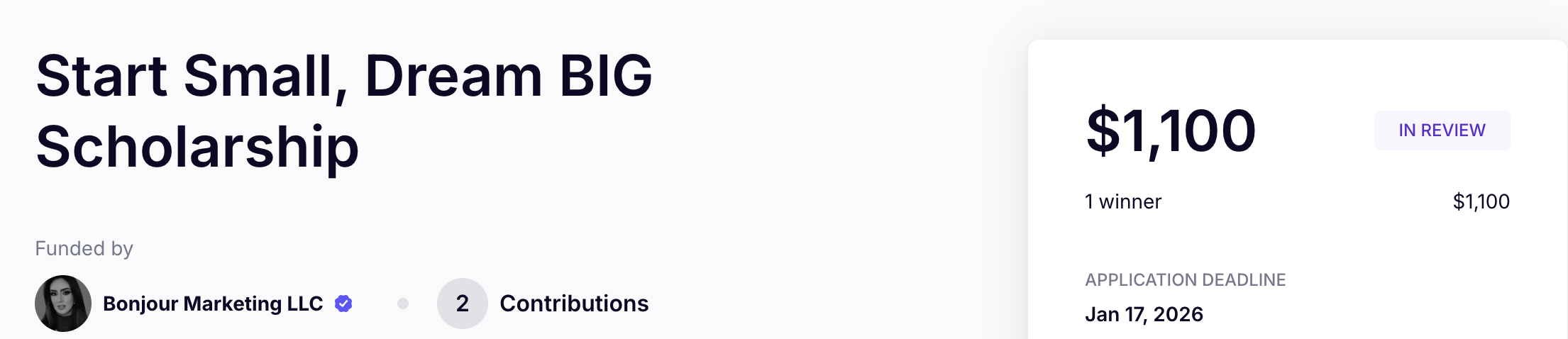 Here’s Bonjour Marketing’s “Dream Big” scholarship. It’s only $1,100.