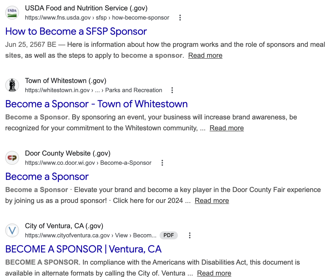 - Existing Partnerships: Look for competitors who work for government agencies or local governments. Find businesses or orgs in your space that already work with government programs, then make a list of the programs or events that are accepting sponsors.