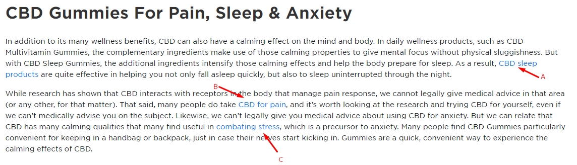 And whilst C has it’s merits, it doesn’t give an exact signal for “CBD” because it’s not within the anchor text itself nor does it have it close enough in the surrounding text. Ideally, we’d just extend the anchor to be: “combating stress using CBD” or “combating stress with CBD”.