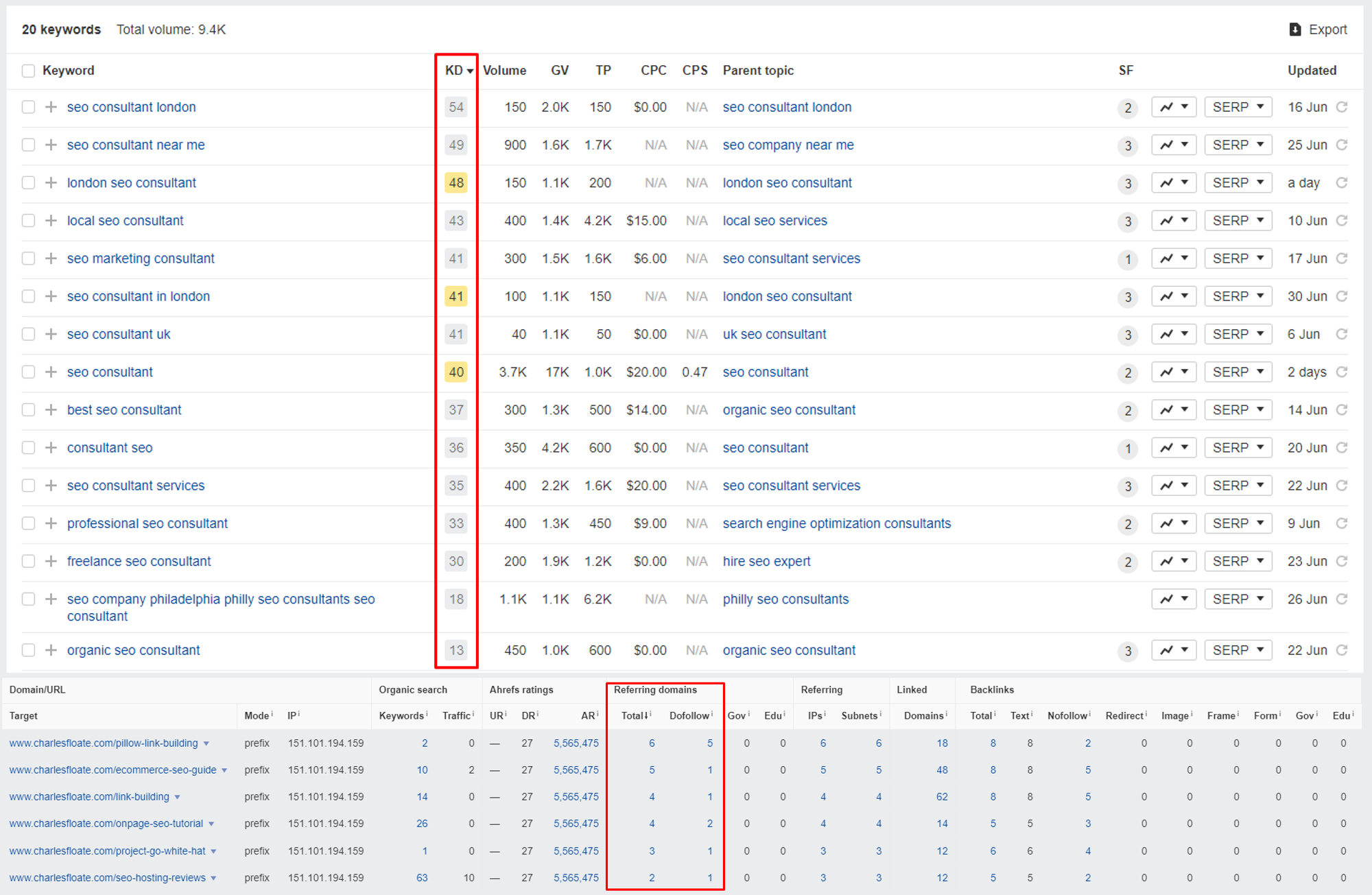- A list of relevant pages, sorted by authority (Use UR, RD etc)