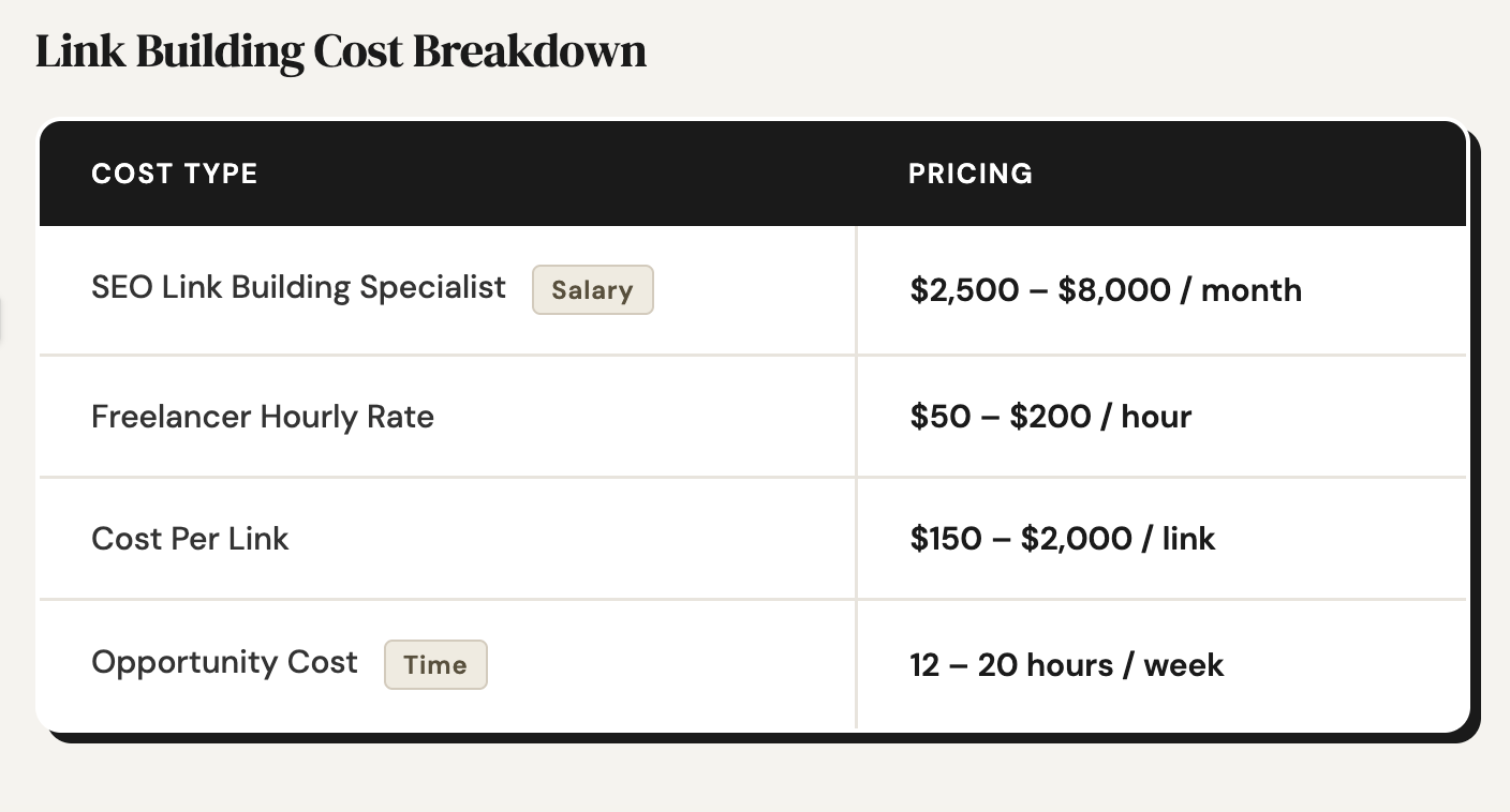 Hiring even one full time link builder costs you a salary, benefits, and tools. That could easily come out to $25,000-$50,000+ a year before you build a single link. A freelancer or a smaller boutique service can get you real links for a fraction of that.