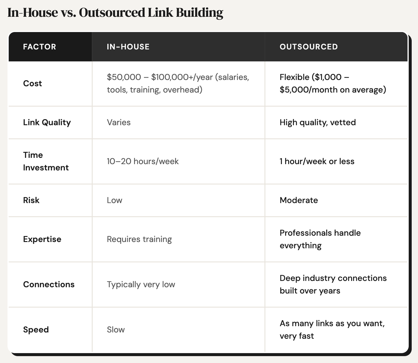 As I said before, outsourcing wins for most businesses. Unless you’re an enterprise with a dedicated SEO team, building links in house is slow and expensive. Outsourcing gets you faster results, proven systems, and specialists who live and breathe link acquisition.