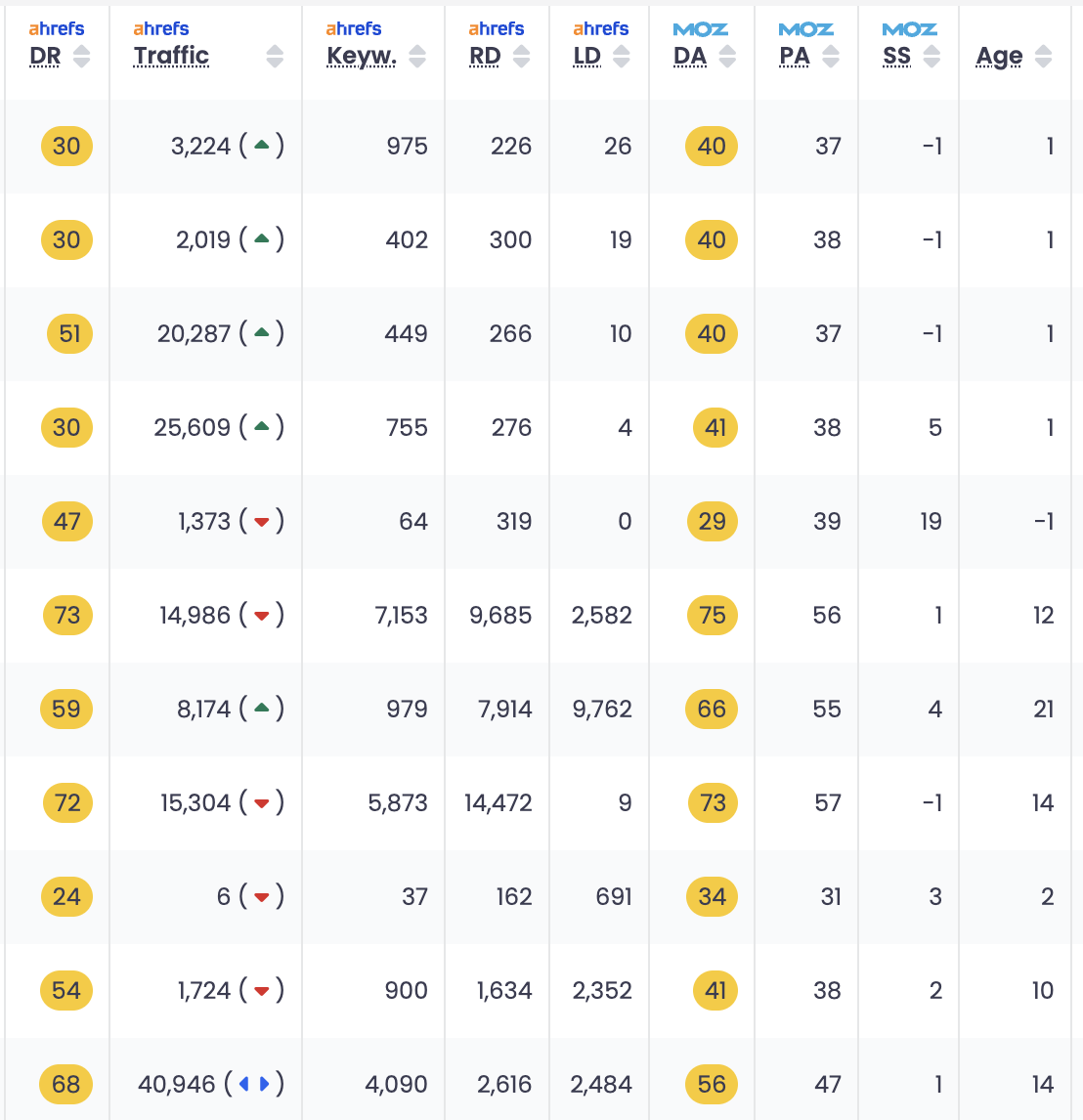 • Moz Domain Authority: Again, not the only thing that matters, but Domain Authority is another helpful score that shows the strength of a website.