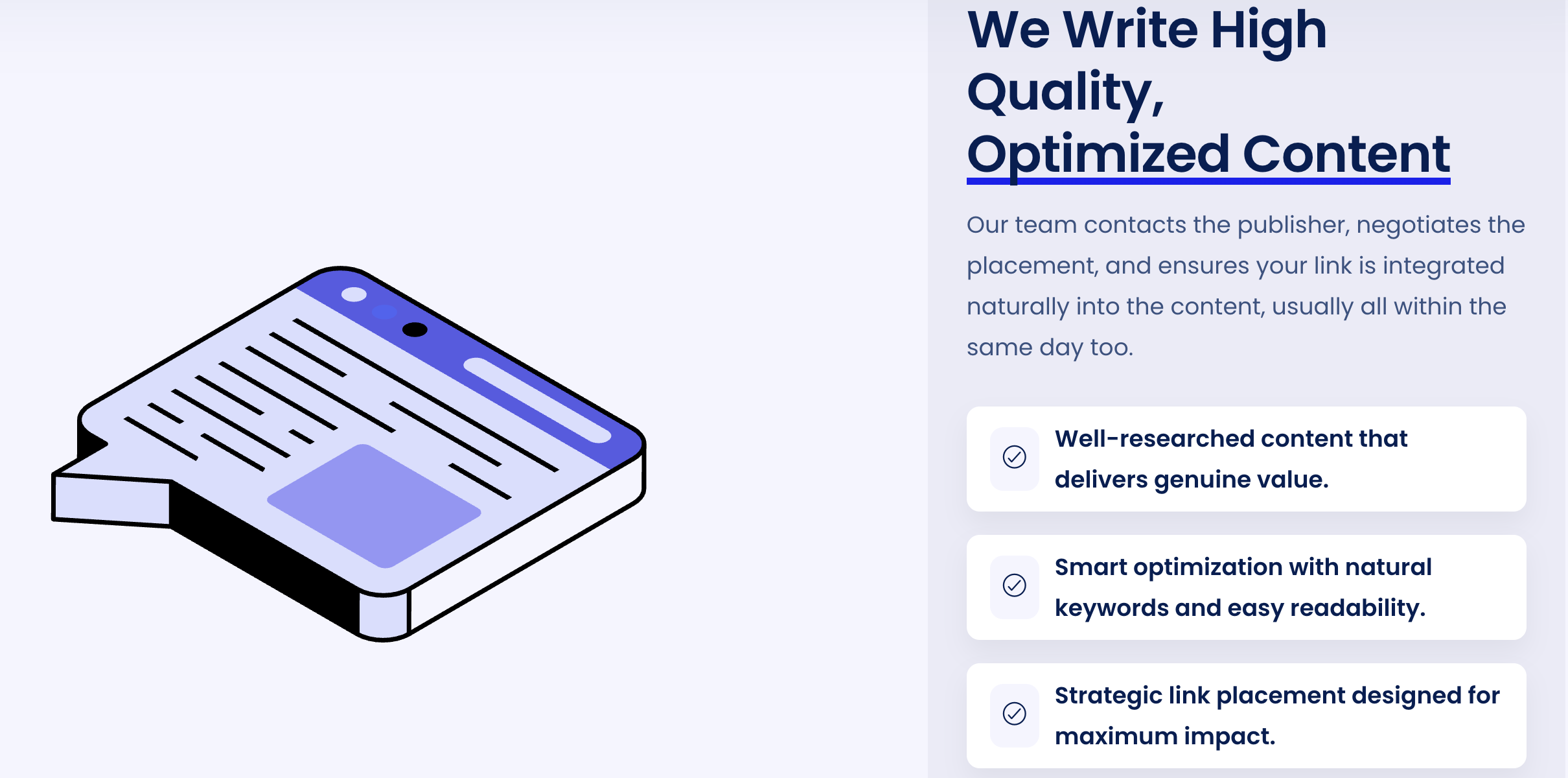 When you outsource link acquisition, your service provider handles the prospecting, outreach, follow ups, and placements. You just sit back and get the links.