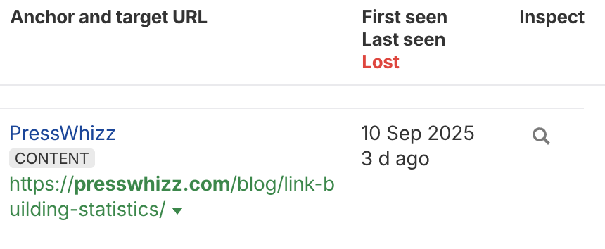 You’ll get a ton of helpful metrics like DR, traffic, anchor text, and target URL:
