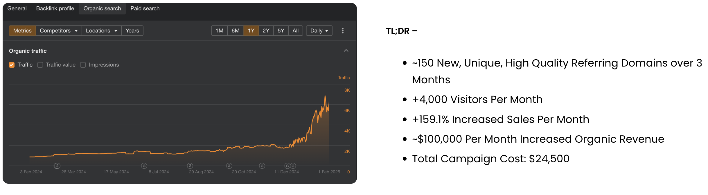 A screenshot from a case study where we built 150 new, unique referring domains for a client over 3 months. The results speak for themselves.